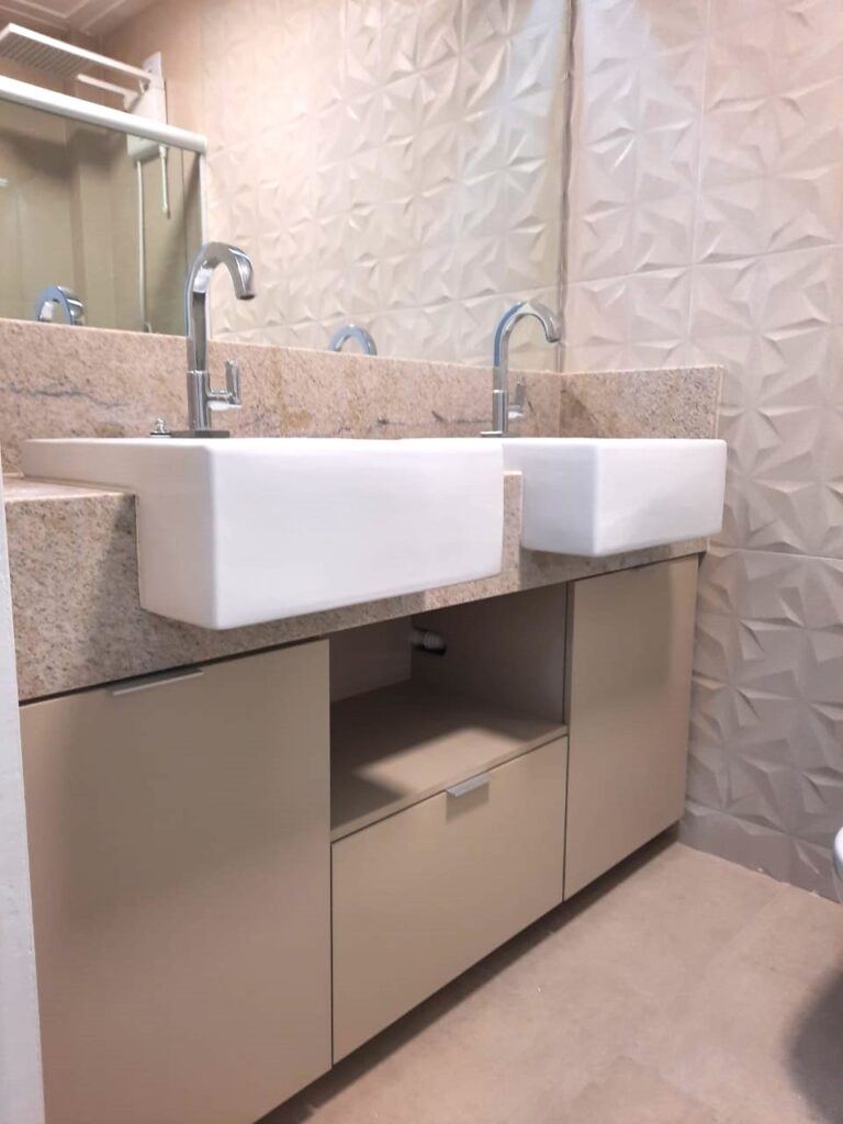 utensílios de banho. O armário superior à bancada, facilita o acesso a produtos de uso diário sem