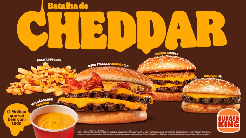 Ofertas válidas de 13/01/2026 a 20/01/2026, exclusivamente nos balcões, totens e drive dos restaurantes participantes, enquanto durarem os estoques. Itens adicionais, trocas ou substituições serão cobrados à parte. As ofertas não são cumulativas com outras promoções, cupons ou descontos vigentes e podem ser encerradas antecipadamente, sem aviso prévio. A disponibilidade dos produtos pode variar conforme o restaurante. Imagens meramente ilustrativas. Consulte as lojas participantes em https://bit.ly/LojasParticipantesCheddar. TM & © 2026 Burger King Company LLC. Uso sob licença. Todos os direitos reservados.