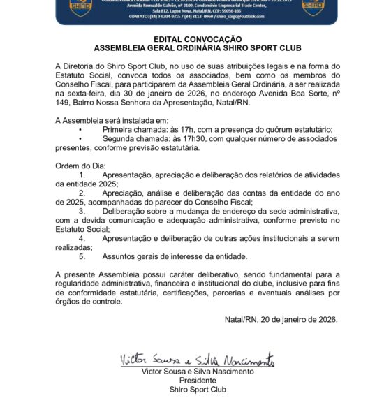 A Diretoria do Shiro Sport Club, no uso de suas atribuições legais e na forma do Estatuto Social, convoca todos...