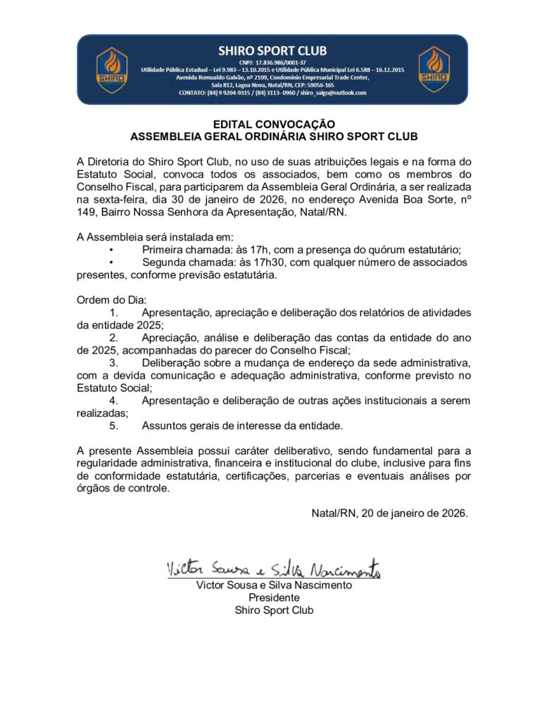 A Diretoria do Shiro Sport Club, no uso de suas atribuições legais e na forma do Estatuto Social, convoca todos os associados, bem como os membros do Conselho Fiscal, para participarem da Assembleia Geral Ordinária, a ser realizada na sexta-feira, dia 30 de janeiro de 2026, no endereço Avenida Boa Sorte, nº 149, Bairro Nossa Senhora da Apresentação, Natal/RN.