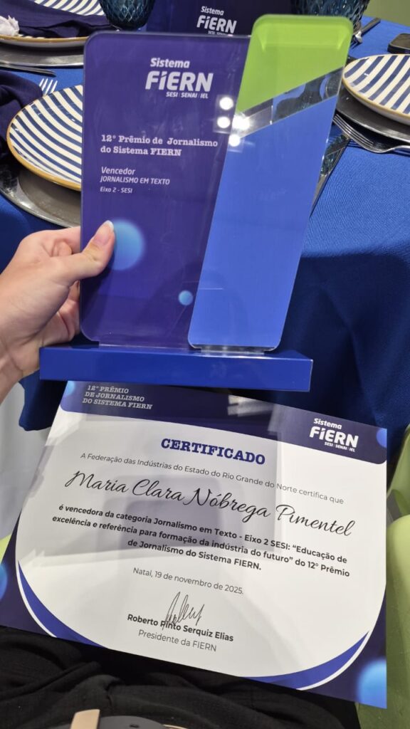 Durante a solenidade, Maria Clara recebeu o certificado concedido pela Federação das Indústrias do Estado do Rio Grande do Norte (FIERN) e o troféu entregue pela superintendente regional do SESI/RN, Danielle Mafra, em um momento de reconhecimento público ao seu trabalho e à relevância do jornalismo produzido no Estado.