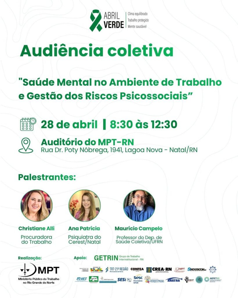 Para discutir esse cenário e promover o diálogo social na busca de soluções e estratégias voltadas à promoção de ambientes de trabalho mais seguros e saudáveis, o Ministério Público do Trabalho no RN (MPT-RN), realizará, no dia 28/04, a Audiência Coletiva “Saúde Mental no Trabalho e a Gestão dos Riscos Psicossociais”.