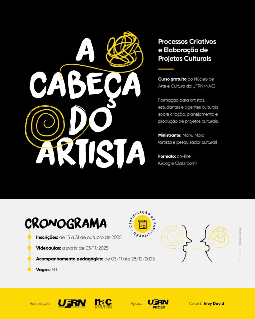 O Núcleo de Arte e Cultura da UFRN (NAC) abre, no próximo dia 13 de outubro, a partir das 8h, as inscrições para o curso online “A Cabeça do Artista – Processos Criativos e Elaboração de Projetos Culturais”, uma iniciativa que busca democratizar o acesso ao conhecimento sobre criação, planejamento e gestão de projetos culturais. A formação é voltada para artistas, estudantes, agentes culturais e demais interessados em transformar ideias em projetos culturais.
