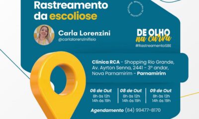 De 06 a 11 de outubro acontece o Rastreamento Nacional da Escoliose! Membros da Sociedade Brasileira de Escoliose estarão em diversas cidades do Brasil realizando gratuitamente...