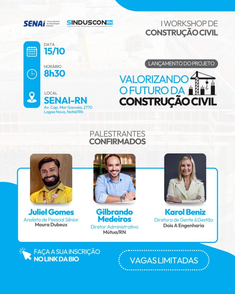 O Sindicato da Indústria da Construção Civil do RN (Sinduscon/RN), em parceria com o SENAI/RN, inicia um importante projeto de qualificação profissional para o setor da construção civil com o I Workshop de Construção Civil, que acontece no próximo dia 15, às 8h30, no SENAI/RN, em Lagoa Nova, Natal. O evento marca o lançamento do projeto “Valorizando o Futuro da Construção Civil”, uma iniciativa que busca fortalecer a mão de obra local, inspirar novos profissionais e promover o desenvolvimento sustentável do setor.
