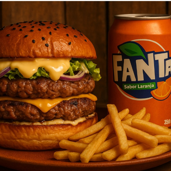 Pão brioche macio, carne suculenta, cheddar fatiado, bacon, cebola caramelizada BURGO+BATATA+REFRI+MOLHO*