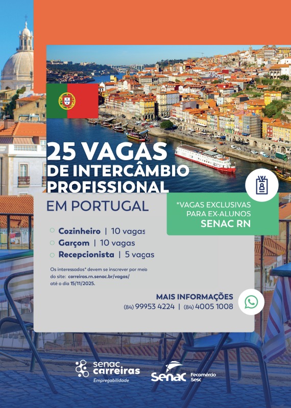 O Senac RN está com inscrições abertas para processo seletivo de intercâmbio profissional em Portugal, em parceria com a rede de hotéis Pine Cliffs Resort, localizada na região do Algarve. Ao todo, são 25 vagas exclusivas para ex-alunos do Senac RN nas áreas de gastronomia e hotelaria. As inscrições podem ser realizadas no portal carreiras.rn.senac.br até o dia 15 de novembro de 2025.